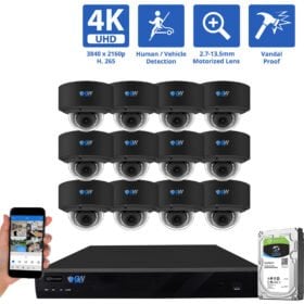 Our versatile 16-Channel 4K NVR Security Camera System is your all-in-one solution for ultimate protection. This system includes 12 4K Ultra HD Turret Cameras, providing a comprehensive and adaptable surveillance setup. Each camera features a Built-In Microphone, 5X Motorized Zoom, ensuring enhanced round-the-clock vigilance. With AI smart functions such as human and vehicle detection, this system is a powerhouse for various applications.