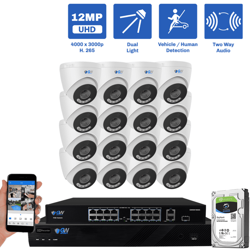This Security Camera System is designed to deliver comprehensive protection in one powerful package. It includes 16 12-megapixel turret cameras and a versatile 32-Channel 12MP NVR that lets you record footage locally with no monthly fees. With built-in microphones and night vision capabilities, these cameras ensure clear audio and video monitoring day and night.