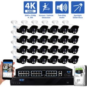 Our versatile 32-Channel 4K NVR Security Camera System is your all-in-one solution for ultimate protection. Equipped with 24 high-resolution 4K cameras, this system boasts Two-way Audio, Spotlight Deterrence, ensuring round-the-clock vigilance. With AI smart functions, such as human and vehicle detection, it’s a powerhouse for various applications.