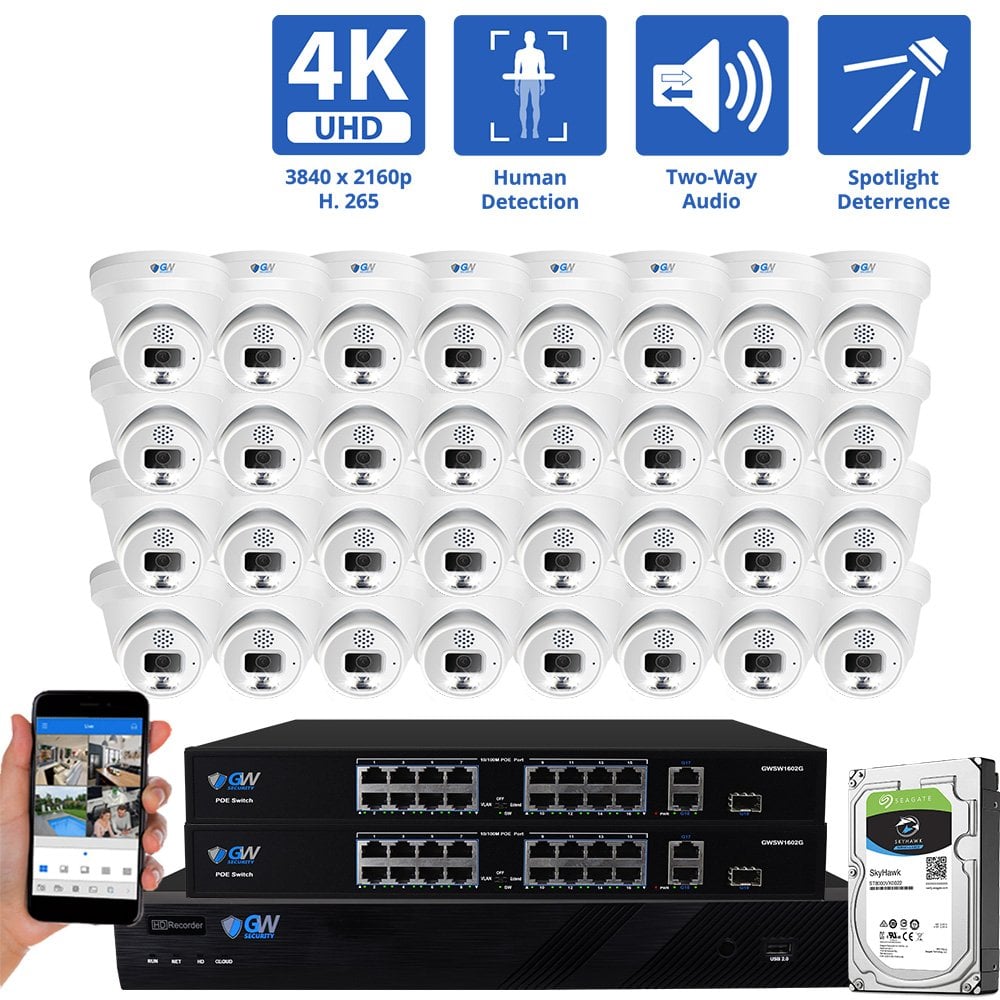 GW Security 32 Channel 8MP H.265 POE/IP Security Camera System, 32ch 4K NVR & 32 × 8MP IP PoE Fixed Lens Spotlight Turret Security Camera, Two-Way Audio, Full-time Color Night Vision, Video Surveillance System for 24/7 Recording