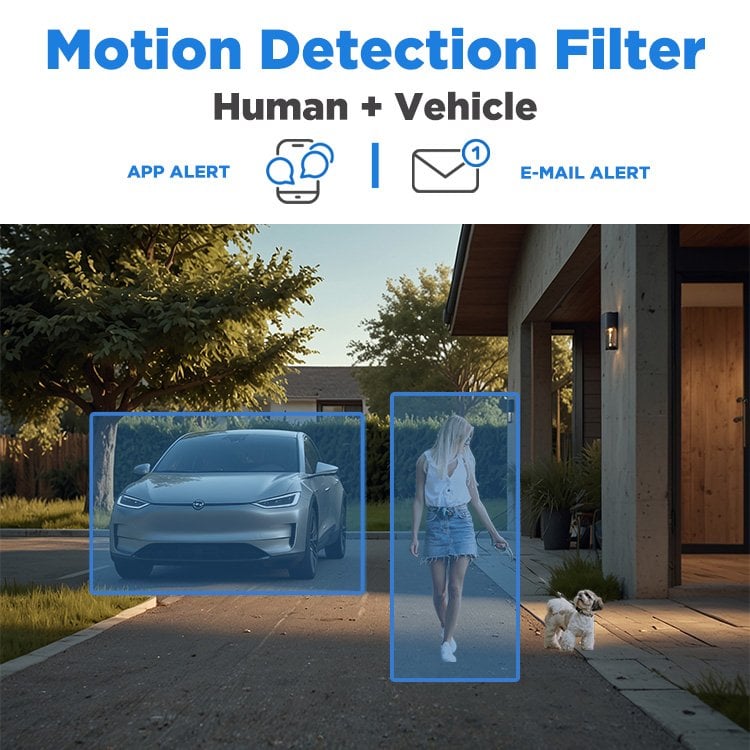 This camera’s motion detection software is equipped with a human and vehicle filter to minimize false alerts triggered by animals, swaying vegetation, or other environmental factors. The cameras are designed to only send alerts when they detect motion from sources resembling humans or vehicles, ensuring more relevant notifications.