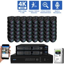 Our versatile 64-Channel 4K NVR Security Camera System is your all-in-one solution for ultimate protection. Equipped with 48 high-resolution 4K cameras, this system boasts advanced features like a Built-In Microphone and Night Vision, ensuring round-the-clock vigilance. 5x Optical Zoom and a 2.7mm-13.5mm Motorized Lens, offering flexibility to focus on details or cover wide areas with precision. With AI smart functions such as human and vehicle detection, it’s a powerhouse for various applications.