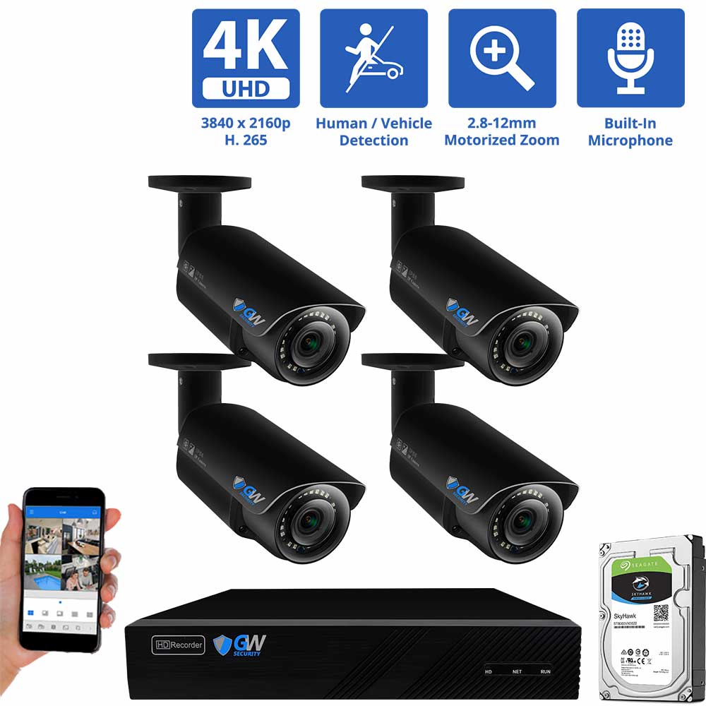 GW Security 8 Channel 8MP IP PoE Security Camera System, 4K NVR with 4 × Outdoor/Indoor 2.8-12mm Motorized Zoom 8.0 Megapixel 3840p Cameras