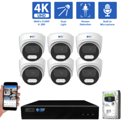 This Security Camera System is designed to deliver comprehensive protection in one powerful package. It includes 6 8-megapixel Turret cameras and a versatile 8-Channel 4K NVR that lets you record footage locally with no monthly fees. With built-in microphones and night vision capabilities, these cameras ensure clear audio and video monitoring day and night.