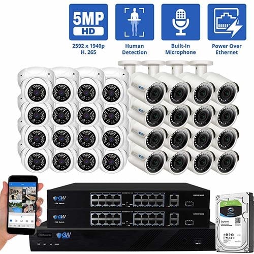GW Security 32 Channel POE IP Security Camera System, 4K 32ch NVR with 16 x 5MP Bullet Security Camera and 16 x 5MP Turret Camera, Video Surveillance System for 24/7 Recording